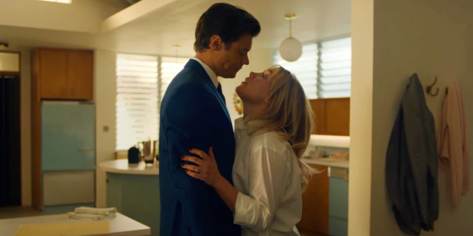 Bebendo nas inspirações do american way of life e da estética dos anos 50, o filme apresenta de cara o casal perfeito vivido por Florence Pugh e Harry Styles. Os dois vivem em uma casa dos sonhos localizada em uma vizinhança segura com cara de subúrbio, mas que está incrustada no meio de um deserto. Nessa vida perfeita, os maridos saem para trabalhar diariamente enquanto as esposas ficam em casa fazendo o que elas têm que fazer: arrumar o lar, beber e fofocar.